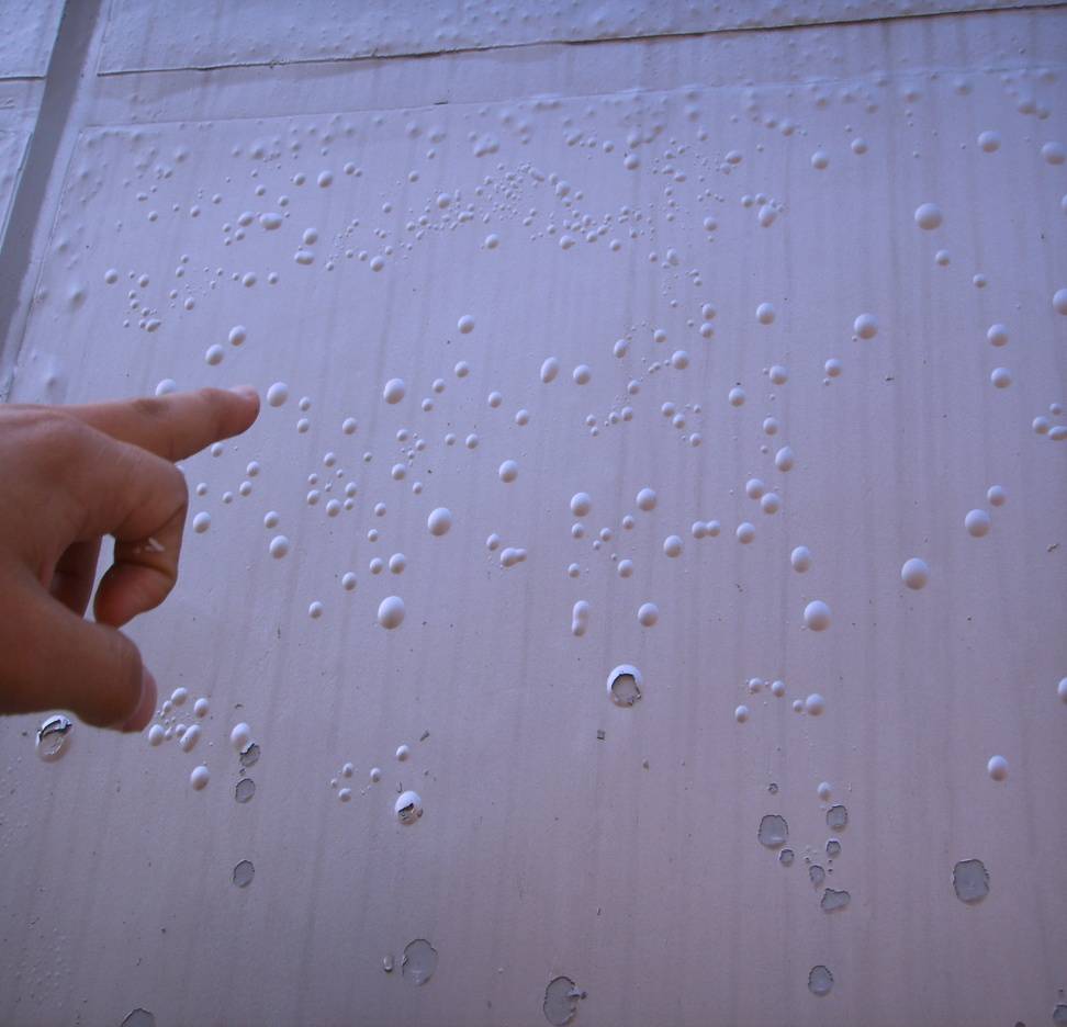 ★ 處理方法:用鏟刀將鼓起部位鏟除,清理干凈,用彈性膩子進行修補,加強抗堿底漆進行墻面批刮和修補,更好是在選擇外墻膩子時選擇正規(guī)的廠家,杜絕將松散的膩子用在外墻面,否則將會造成很多麻煩(如有一廠房工程,每刮一次臺風我們都得去修補一次)。